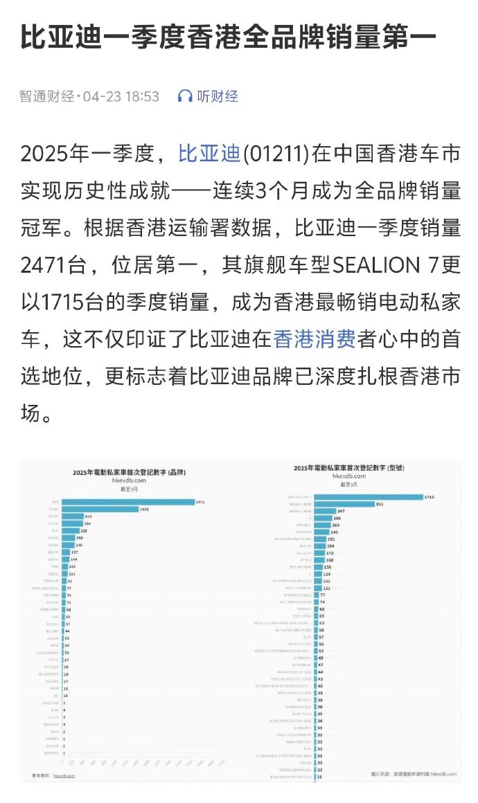 就拿香港举例子,比亚迪在香港以 2471 辆私家车首次登记量,力压丰田(1556辆)、特斯拉(1430辆),首次摘得香港汽车市场销量桂冠!其中SEALION 7(海狮07)以1715台的季度销量,成为香港最畅销电动私家车。同时,比亚迪已构建起覆盖全港的 13 家销售和售后服务网络,为车主提供高质量的服务体验,这也是比亚迪在香港畅销的原因。