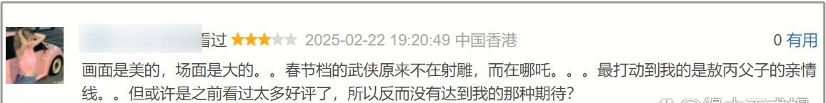 另外一位给出3星的香港观众,先是肯定了《哪吒2》画面很美,场面很大,春节档的武侠原来不在《射雕》而在《哪吒2》,而且敖丙父子的亲情也很打动人,但或许是之前好评太盛,所以反问不如预期。