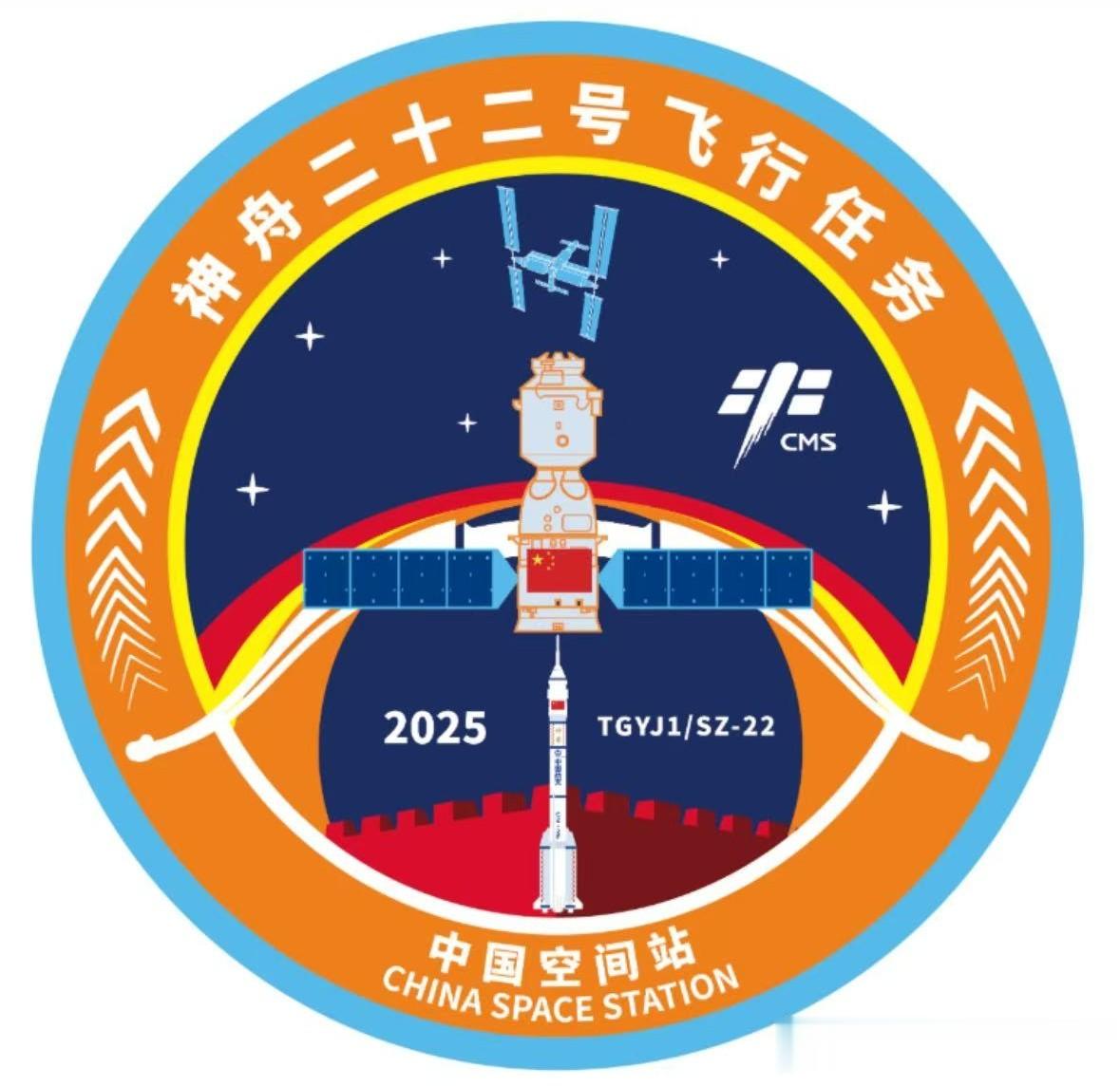 “神舟”22号飞行任务的标识设计与以往略有不同。除了常规元素外,这次特别融入了“应急救援”主题,通过色彩来讲述任务背后的意义。蓝色象征雄厚的航天科技实力,红色代表使命担当,而橙色则突出了应急任务的迅捷、高效与时刻待命的特性。整体视觉既延续了标识一贯的稳重美学,又加入了全新的应急元素,传递出“以航天力量守护生命安全”的核心理念。