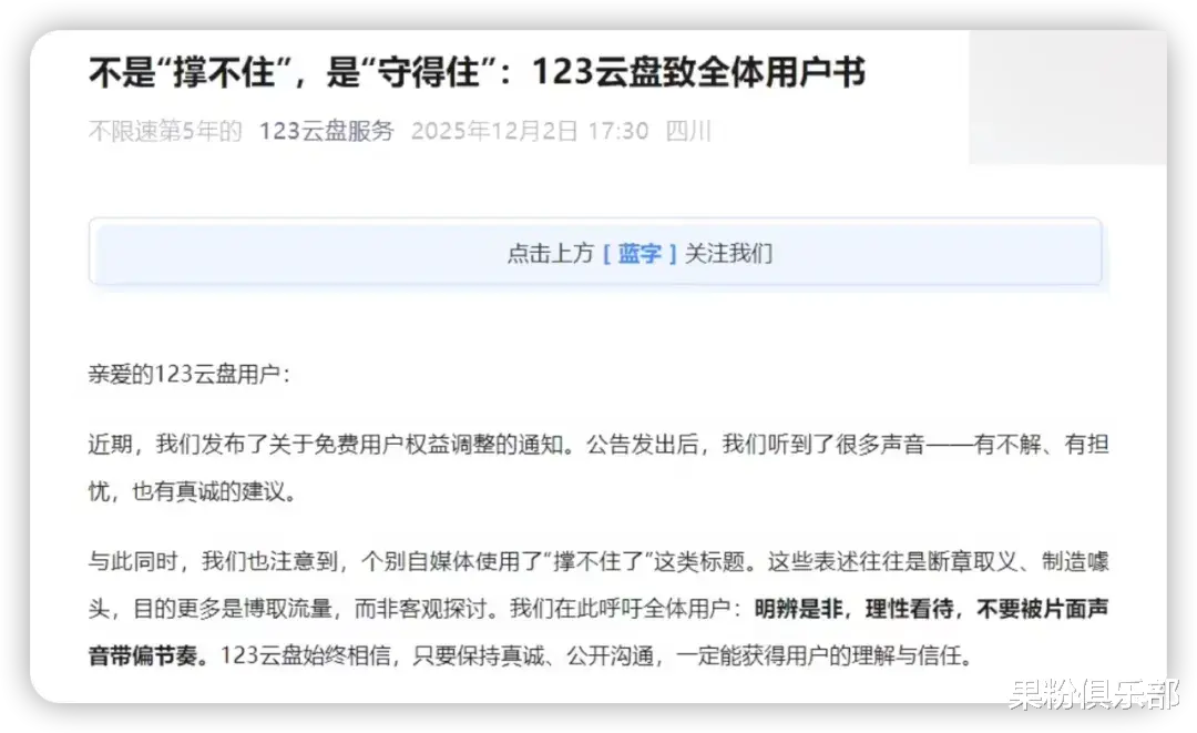 文中,123 云盘断然否认了「撑不住要跑路」的说法。