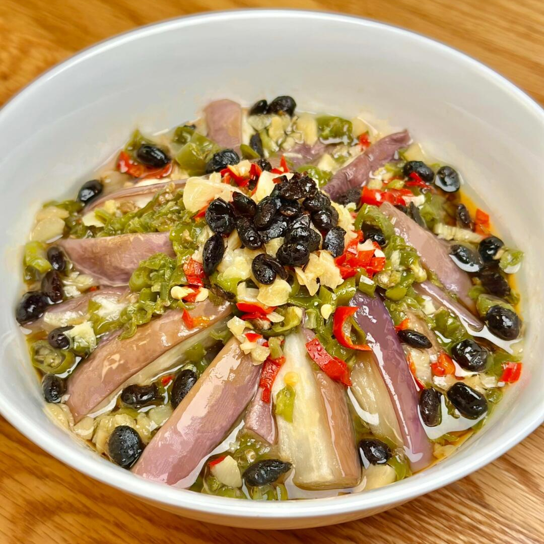 食材:茄子切条、青辣椒碎(湖南椒)、红辣椒碎、蒜沫、豆豉