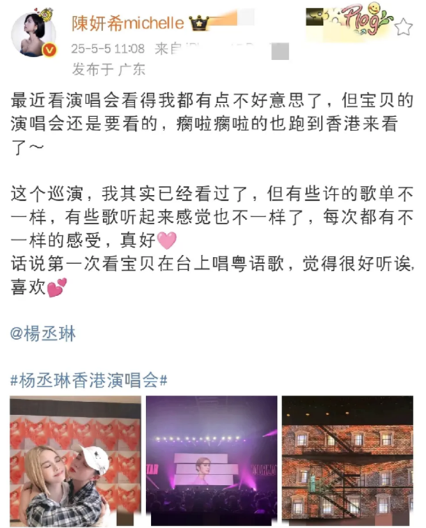 其实就在杨丞琳演唱会的前一天,陈妍希还飞去澳门看了容祖儿的演唱会,并在后台和容祖儿亲密拥抱。