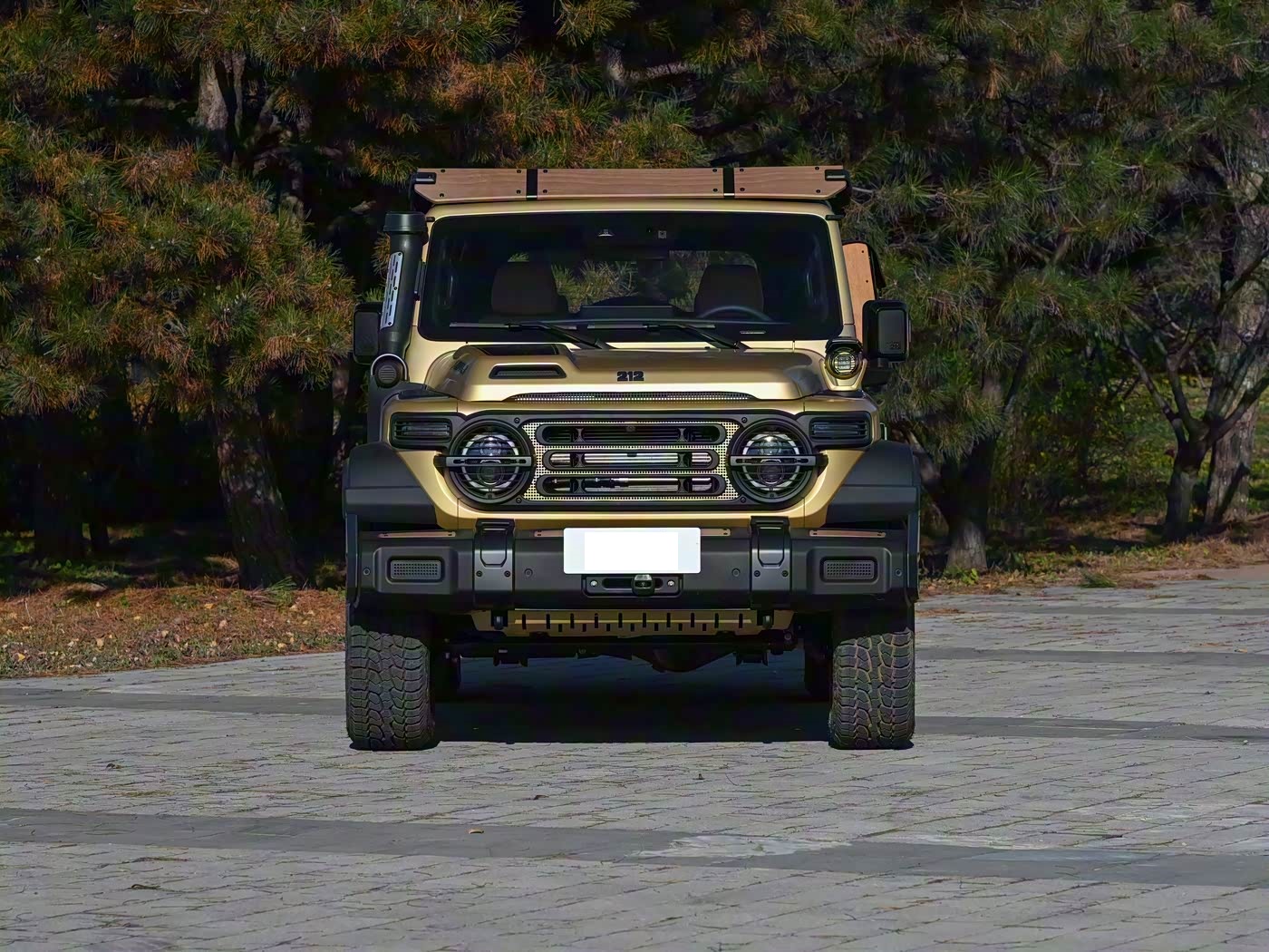 我们首先来看新车的外观设计方面,T01高地版的车头设计堪称“武装到牙齿”。前脸采用经典的“一拱、二圆、三横、四纵”设计语言,圆形大灯与贯穿式LED日行灯的组合,既保留了老款212的复古韵味,又增添了现代科技感。前保险杠采用仿木纹枪托设计,搭配金属防撞梁,不仅提升了视觉冲击力,还能有效保护车身免受碎石撞击。最引人注目的是涉水喉设计,其造型灵感源自迫击炮,不仅增强了涉水能力(深度达910mm),还配备了军士铭牌风格的涉水深度标识,细节处尽显硬核气质。 此外,前杠两侧的射灯采用防爆网造型,既能防石防撞,又为夜间越野提供了充足照明。
