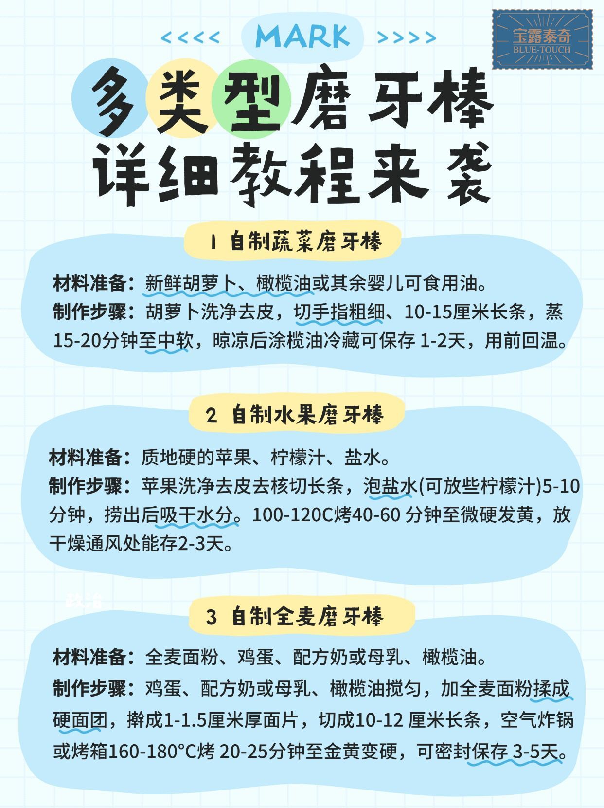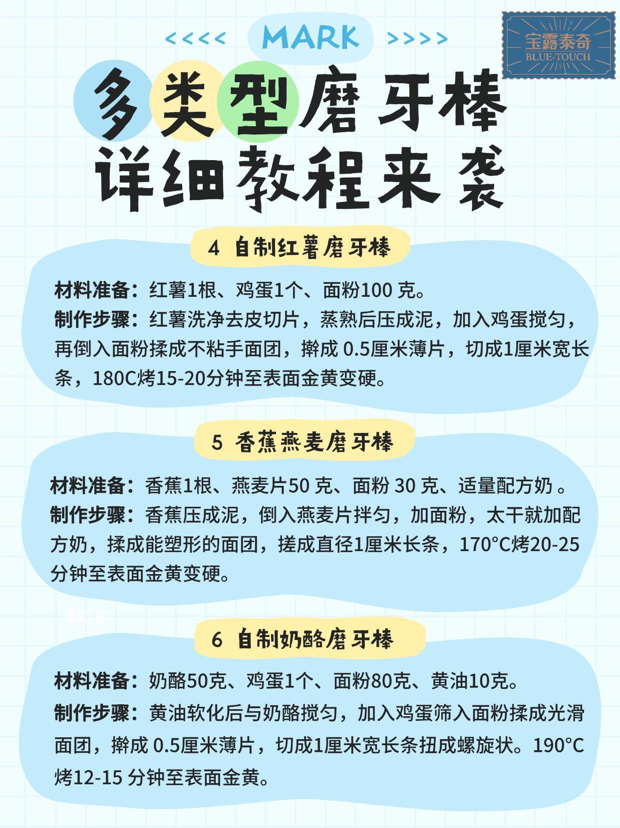 制作步骤把鸡蛋、配方奶或母乳、橄榄油放在一起搅匀,然后加入全麦面粉,揉成一个硬面团。将面团擀成 1 - 1.5 厘米厚的面片,再切成 10 - 12 厘米的长条。可以用空气炸锅或者烤箱,以 160 - 180°C 的温度烤 20 - 25 分钟,直到磨牙棒金黄变硬。密封保存能放 3 - 5 天。全麦面粉富含膳食纤维和多种维生素.