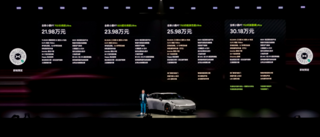 全新小鹏P7定位为未来AI豪华轿跑,新车共发布702长续航Ultra、820超长续航Ultra、750四驱高性能Ultra与750四驱鹏翼Ultra四款车型,官方指导售价分别为21.98万元、23.98万元、25.98万元和30.18万元。