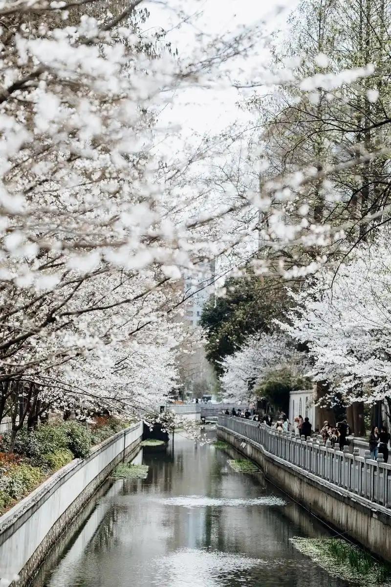 近年来的网红赏樱地,河两岸樱花低垂到水面,花瓣落入河中顺流飘洒,形成独特的"樱花河"景观。这里人少安静,没有旅游团,是避开人潮的绝佳选择。