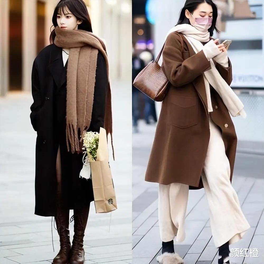 就算是00后的美少女,年轻有活力,如果整套穿搭全是黑色,那也会显得沉闷,所以下面这位时尚达人在用大地色系的围巾和中筒靴来点缀,让整体造型的配色更有活力。