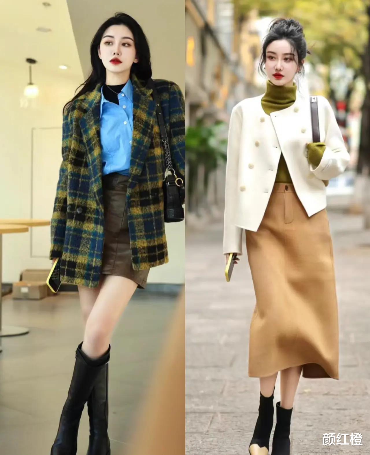 年龄在40岁到50岁之间,这个时候肯定想要穿出优雅的感觉,那么推荐大家可以选择半身裙的搭配,裙子长度盖过膝盖到小腿肚的位置,适当的露出肌肤,再穿上一款短靴就能很好的延伸你的腿部线条,例如下左边这一套穿搭就很不错。