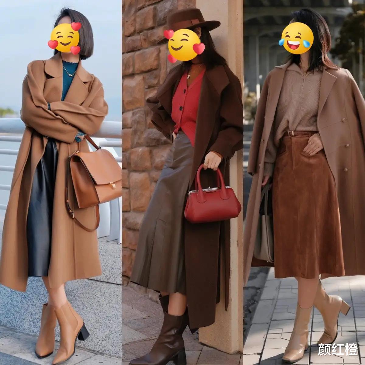 比如中间这1套用深棕色的大衣外套,这时候就用红色的针织开衫和棕色的皮质半身裙来搭配,形成一个撞色的效果,让整个造型更有层次感。同时,红色的衣服和包包点缀之后,让整体配色更有活力感。