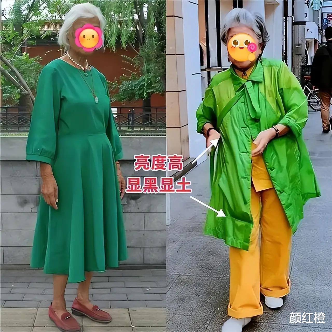 亮色的衣服,不要说是五六十岁的中年女性了,年轻貌美的少女穿了也会显黑显土,下面这种绿色的裙子和绿色的衬衫外套搭配上黄色的长裤,怎么穿都会使得皮肤暗黄变黑。