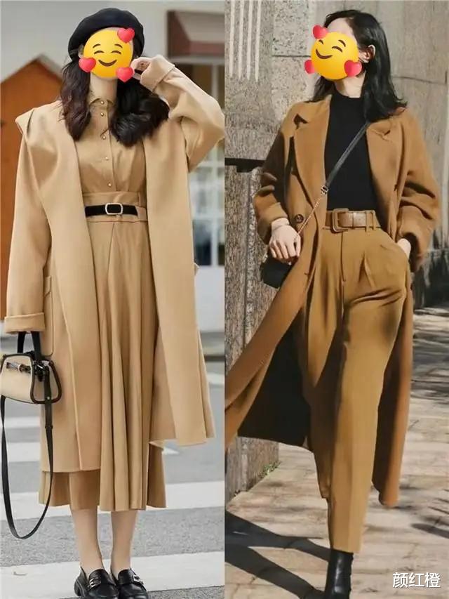 同样是穿大衣外套,穿裙子会比较优雅得体,有女人味,选择西装裤来搭配就会比较干练,都很适合职场女性穿搭。下面这两套不管穿,去上班,逛街,约会都没有任何问题,通勤又时髦。