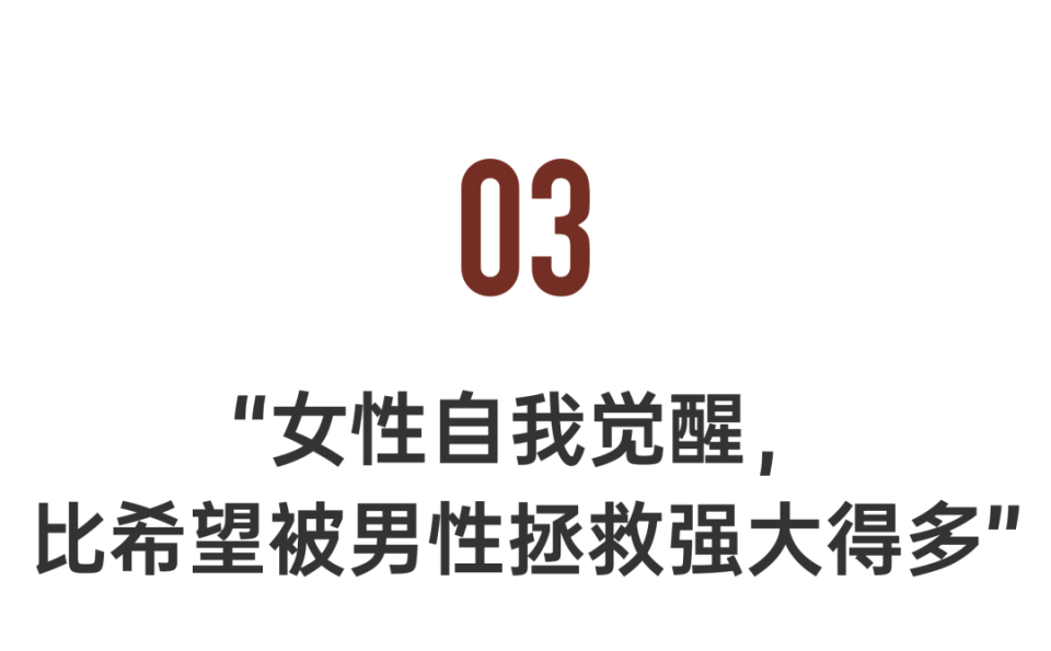 “意识到自己能自救,找到勇气,认识到自己作为女性和人类的价值,我相信,这种自我觉醒远比希望一个男人来拯救她,要强大得多。”