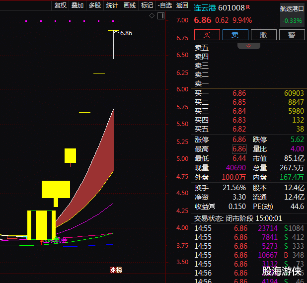 从技术面上来看,连云港(601008)该股在板块的带动下,6天6板!6个交易日股价上涨了77.72%!均线呈现多头排列,MACD有继续上扬的动力,主力资金呈现流出状态。