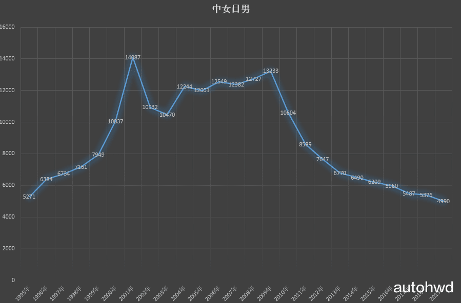 而日本人娶中国老婆的数据却差异非常的大,在1995年到2000年之间,每年的数据都稳定提升,而到2001年,日本娶中国老婆达到14087对,达到最高值,到2010年后逐年下降跌破1万对,之后稳步下降,直到2019年,只有4990对。跌至历史最低值。