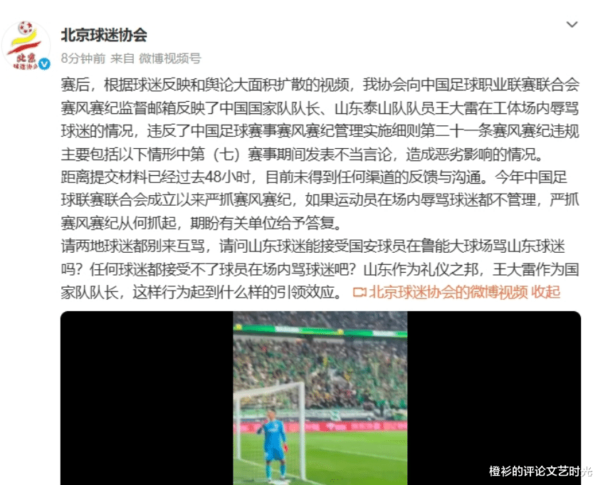 微博名为“北京球迷协会”的蓝V认证账号发布视频,称该协会已向中国足球职业联赛联合会赛风赛纪监督邮箱反映了王大雷在工体场内辱骂球迷的情况。