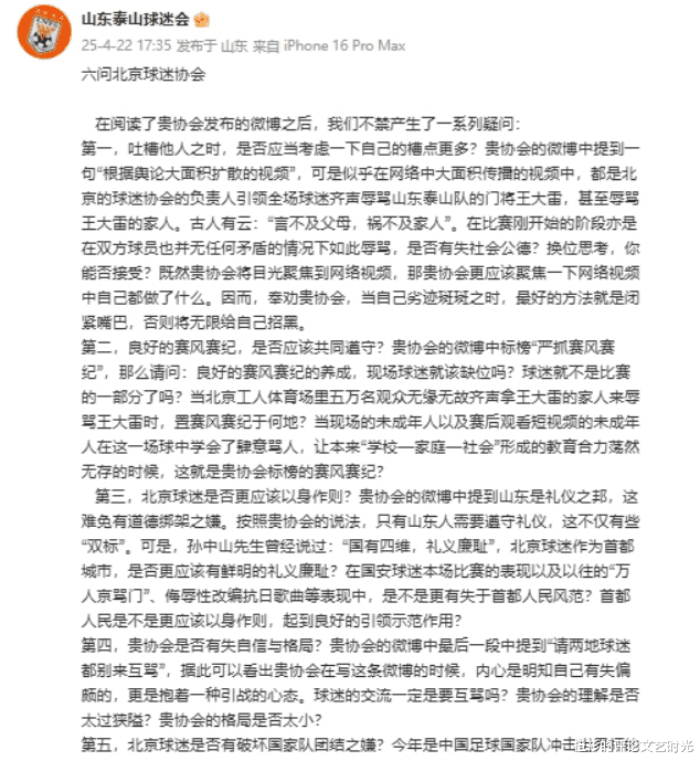 对于国安这个球迷协会的挑衅,山东泰山队球迷协会给出了合理的反击,他们用6个标准回击了国安球迷的不雅挑衅,最终”北京球迷协会“在微博删掉帖子,毕竟他们也知道自己做的不正确,不合理。他们删掉帖子,也是给自己留点颜面。