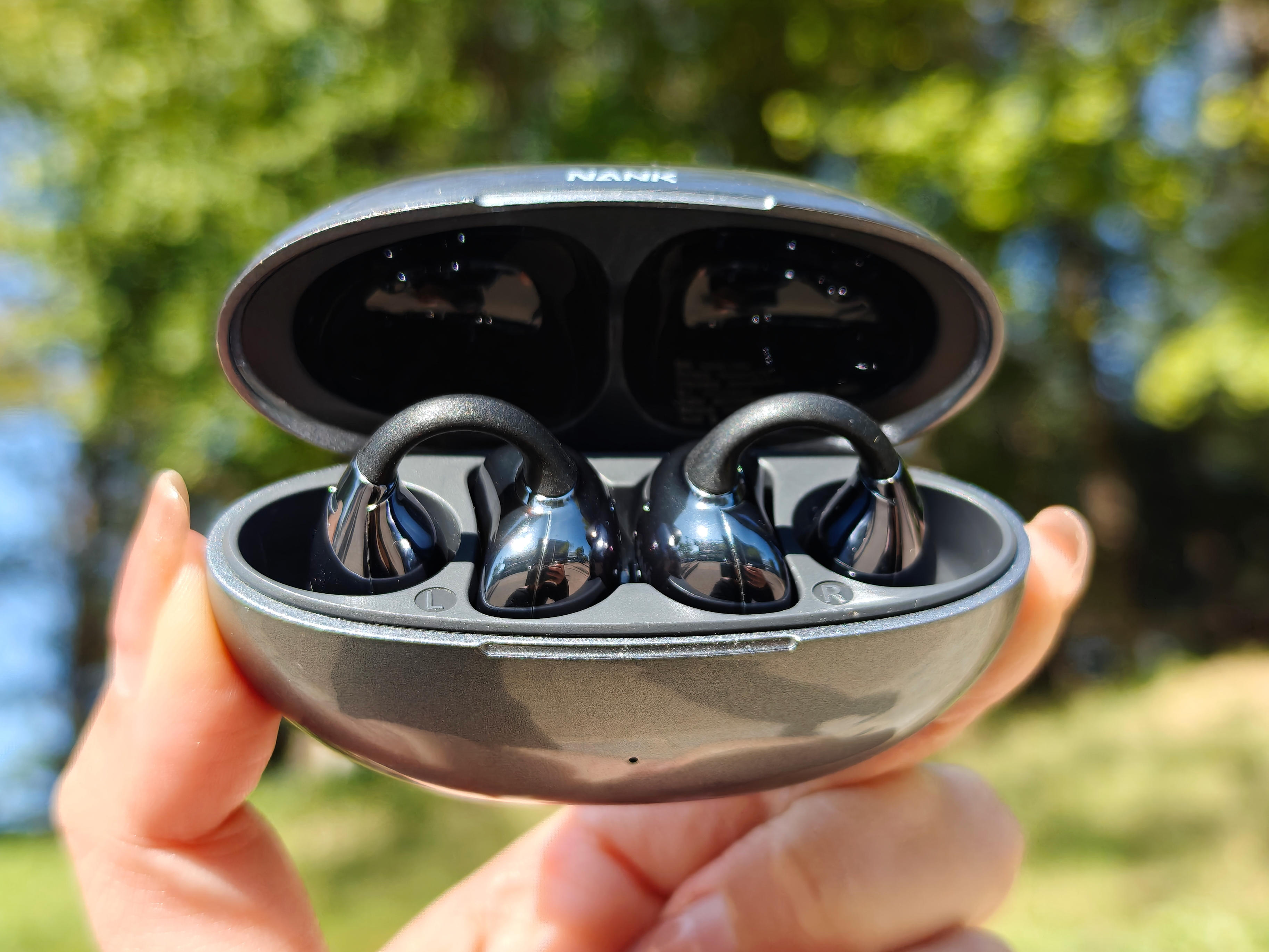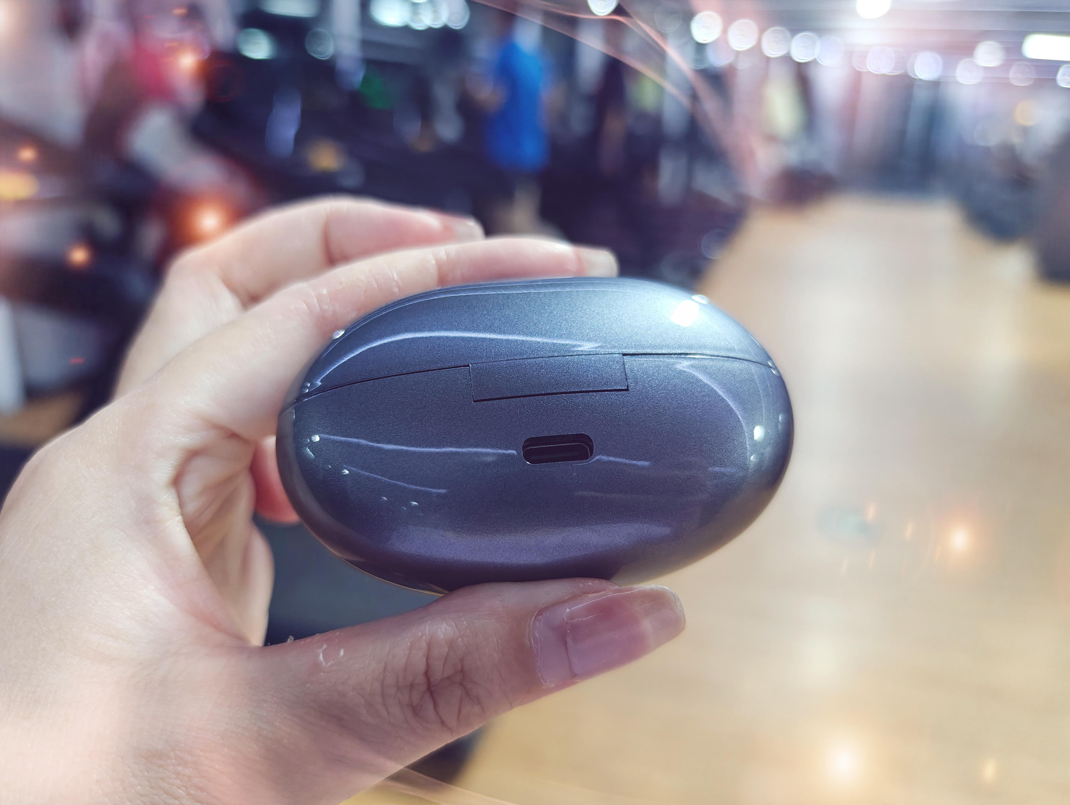 南卡Ultra耳夹式耳机采用的是鹅卵石造型的充电盒,采用了镜面反光设计,能在不同的光环境下呈现出不同的色彩美感。搭配银灰配色,金属质感强烈,高级感满满!包装盒正面有南卡品牌logo和指示灯,背面是一个Type-C充电口。