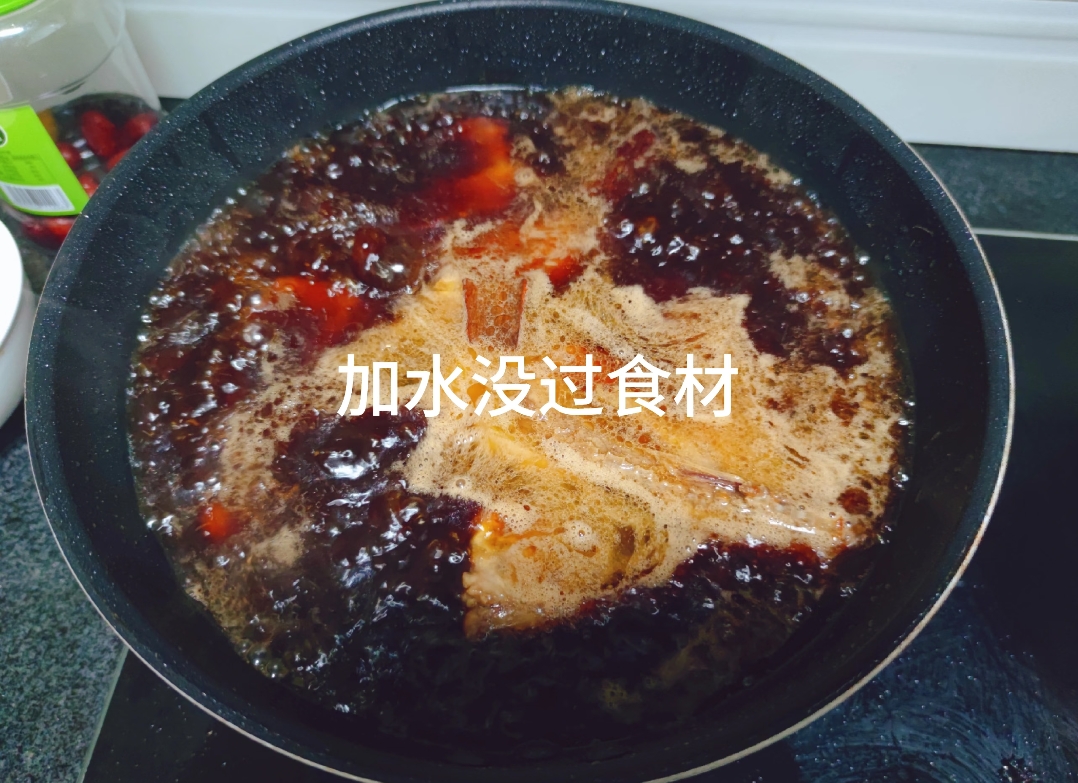 利用煎鸭皮逼出的底油,下入八角、桂皮、香叶、干辣椒,再添些姜葱爆香。实在没有桂皮单用姜片也可,怕辣者省去辣椒同样美味。随后将鸭腿归位,加入一大勺生抽提鲜、半勺老抽上色、半勺冰糖增亮提味,再揉进小半勺蚝油。接着倒入没过鸭肉的热水,并沿着锅边淋一圈料酒去腥增香,大火烧开。