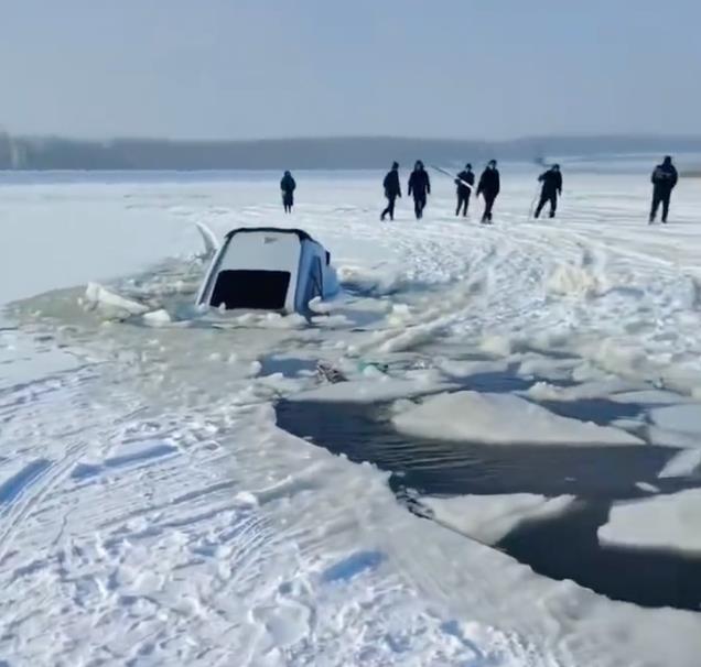 近日,黑龙江哈尔滨木兰县三胜村,一辆白色suv陷入冰面。