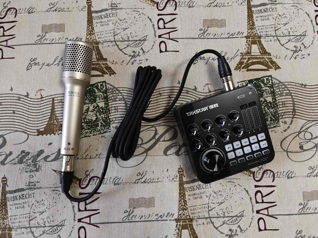 我将MX1 Pro通过Type-C连接Windows电脑,搭配得胜PCM103专业电容麦克风(需开启48V幻象供电),使用得胜TS-2320监听耳机进行抖音直播测试。