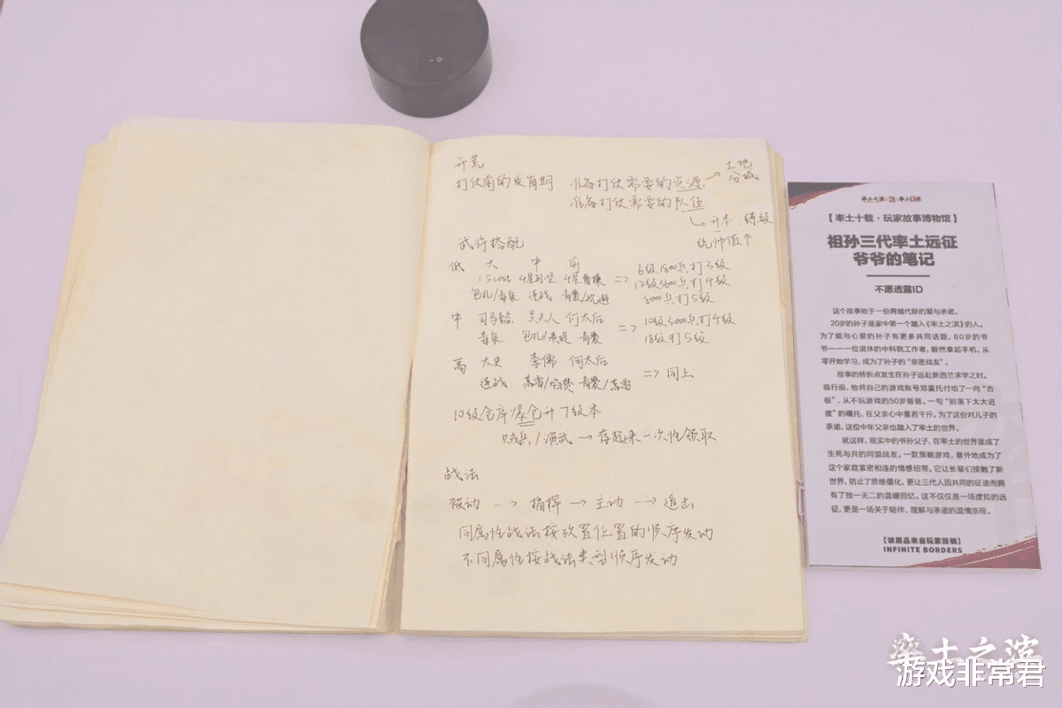 这是一位80岁老爷子的手写攻略本。得知20岁的孙子喜欢《率土之滨》后,为了能和孙子有更多共同话题,老人从零开始学习玩游戏,还用一个小本子认真记录攻略。后来,孙子把账号托付给了原本古板的爸爸,一句“别落下进度”的嘱托,成了父亲沉默的誓言。从此,一家三口在游戏里成了并肩作战的战友。爷爷的笔记上密密麻麻记满了战法搭配要点,一笔一划,都是跨越三代人的陪伴与爱。