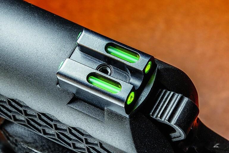 瞄具采用双色光纤设计,前准星是红色光纤管,后照门是两根绿色光纤。所有瞄具都安装在坚固的钢制外壳中,后照门前端是平的,方便单手操作。手枪还附带备用光纤管,必要时安装也很方便。