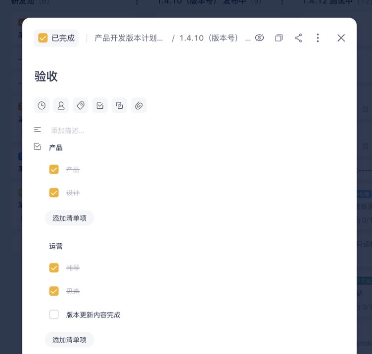 传统的项目管理中,风险控制往往侧重于事后补救,难以有效避免风险的发生。而数字化转型为项目管理带来了全新的风控理念和手段。智能化可以通过实时数据监控和智能预警系统,对项目中的潜在风险进行提前识别和预警。板栗看板设置了验收子清单,要求必须每个岗位的人员都参与验收并勾选后,才能完成该项目,从而实现从“事后补救”到“全程免疫”的安全进化。
