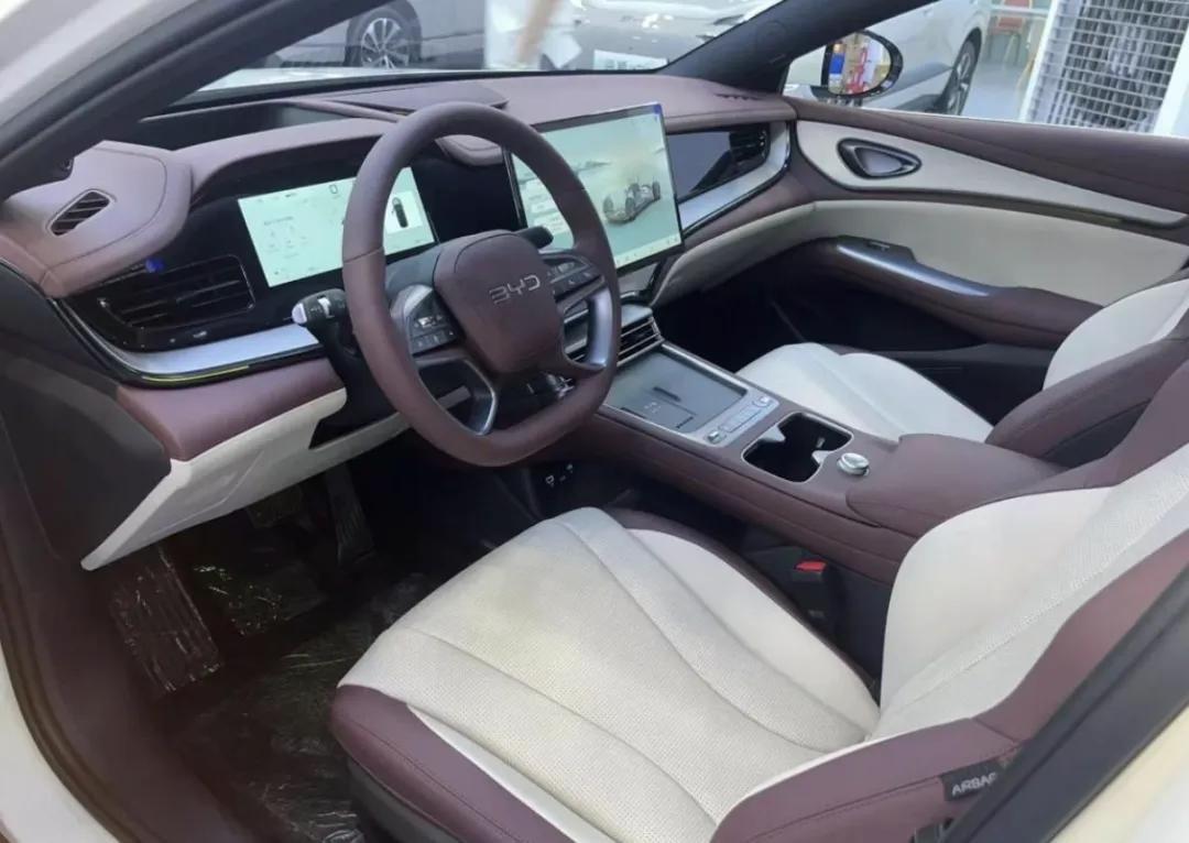新款比亚迪海豹07DM-i的车内配备了全液晶仪表、悬浮式中控屏、四辐式平底方向盘,值得一提的是,海豹07DM-i这次改用了怀挡式的换挡机构,并且根据实拍图来看,全新比亚迪海豹07DM-i还将会在中央扶手箱位置,配备冷暖冰箱。