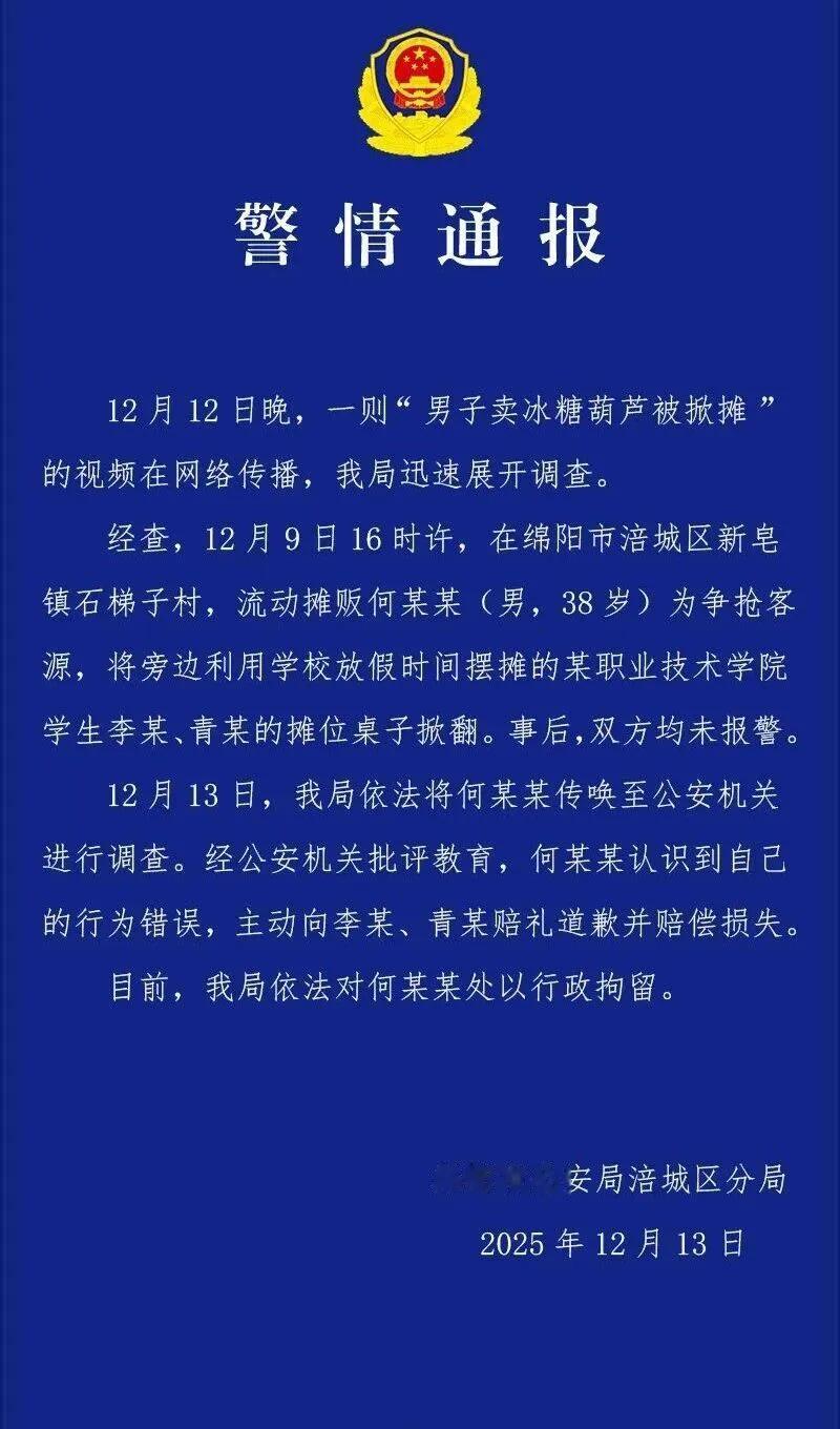 12月13日,绵阳市公安局涪城区分局发布警情通报称,流动摊贩为38岁的何某某,经公安机关批评教育,主动赔礼道歉并赔偿损失。目前,他已被行政拘留。