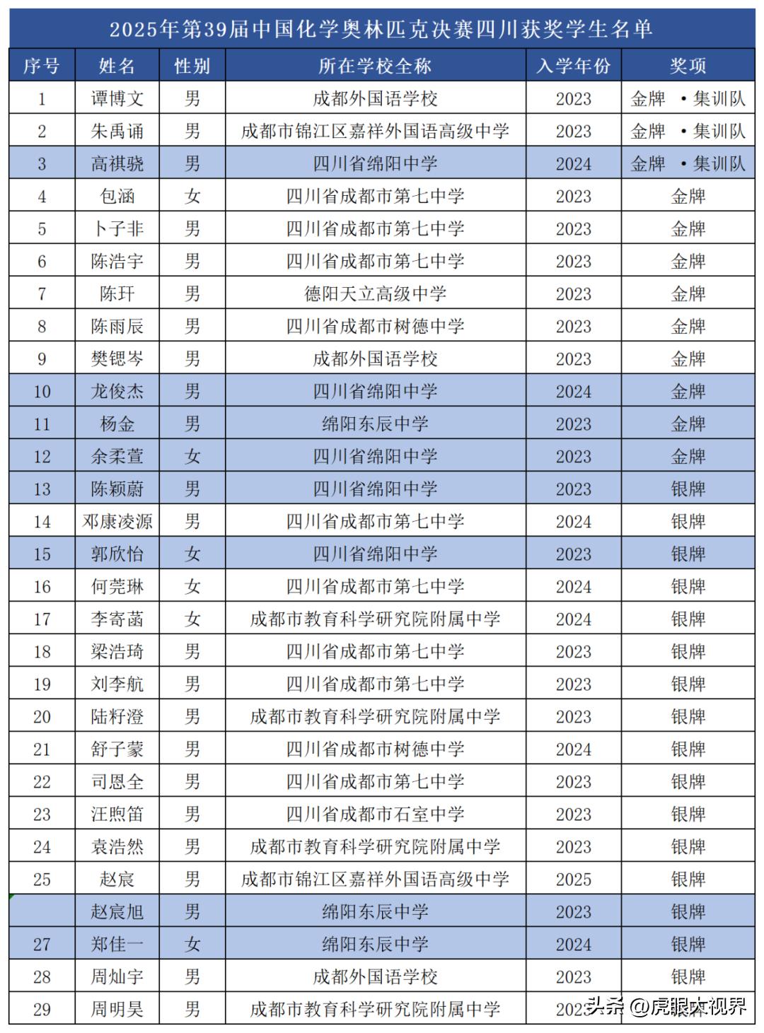 这些获奖学子分别来自三所学校:绵阳东辰中学1国集4金8银2铜、绵阳中学1国集5金8银、南山中学2银。获得金银牌的学生,同时也获得了强基破格录取资格。