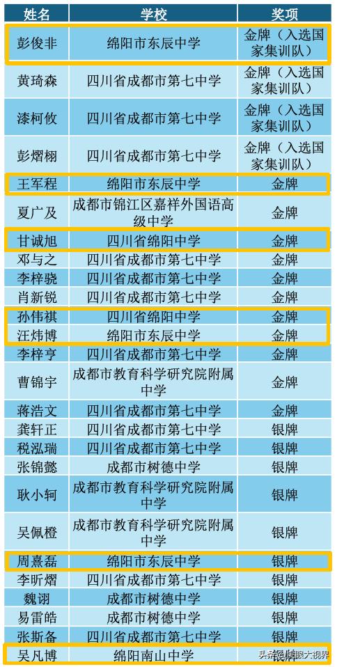 绵阳中学,以14人的总获奖人数,位居成七和东辰之后,全省第三。