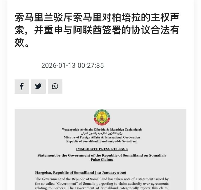 因为就在索马里政府撕毁与阿联酋所有协议的当天,索马里兰政府发声明,他们和阿联酋之间的安全合作协议,不受索马里的控制,会继续发展与阿联酋在柏培拉港的关系。