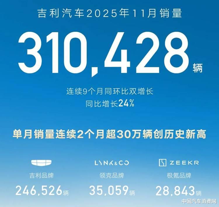 继10月销量首破30万后,吉利汽车一鼓作气,11月份以超31万台的销量再创历史最佳成绩,实现连续9个月同环比双增长,新能源销量187798辆。这其中吉利品牌交出了246526辆的成绩单;领克品牌销售35059辆;极氪品牌销售28843辆。再细分来看,在吉利品牌超24万台的销量中,吉利中国星系列卖了113874辆,吉利银河卖了132652辆。