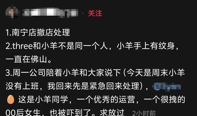 反转!金主“况总”一怒斩雇员令人意想不到的是,当事件持续发酵时,一关键人物“况总”的出现,似乎为原配找回了一丝公道。这位男子的老板得知始末后,第一时间开除涉事员工并让他撤掉经营的门店,用实际行动表达了对其背信弃义行为的愤怒。