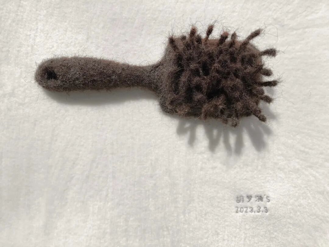 作品说明:我将自己梳落的头发积攒起来,制成自己常用的那把梳子,形成一种倒置的链接:是“我”梳理了发,也是发重塑了“我”。