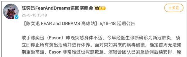 5月15日的时候,陈奕迅的歌迷收到了一个坏消息,歌手陈奕迅在前一天晚上突然觉得身体不舒服,去看医生后确诊得了新冠,让原本定在5月16、17、18号在高雄巨蛋的三场演唱会只能延期了。