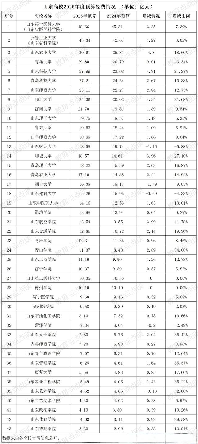 排名山东省属高校经费预算第4名的是青岛大学,29.8亿,离30亿仅仅就差了2千万,比2024年的经费预算大涨了43.34%,是山东省属高校中涨幅最高的。从资料上来看,这次大幅增长的的经费或许是用来建设学校新校区的。