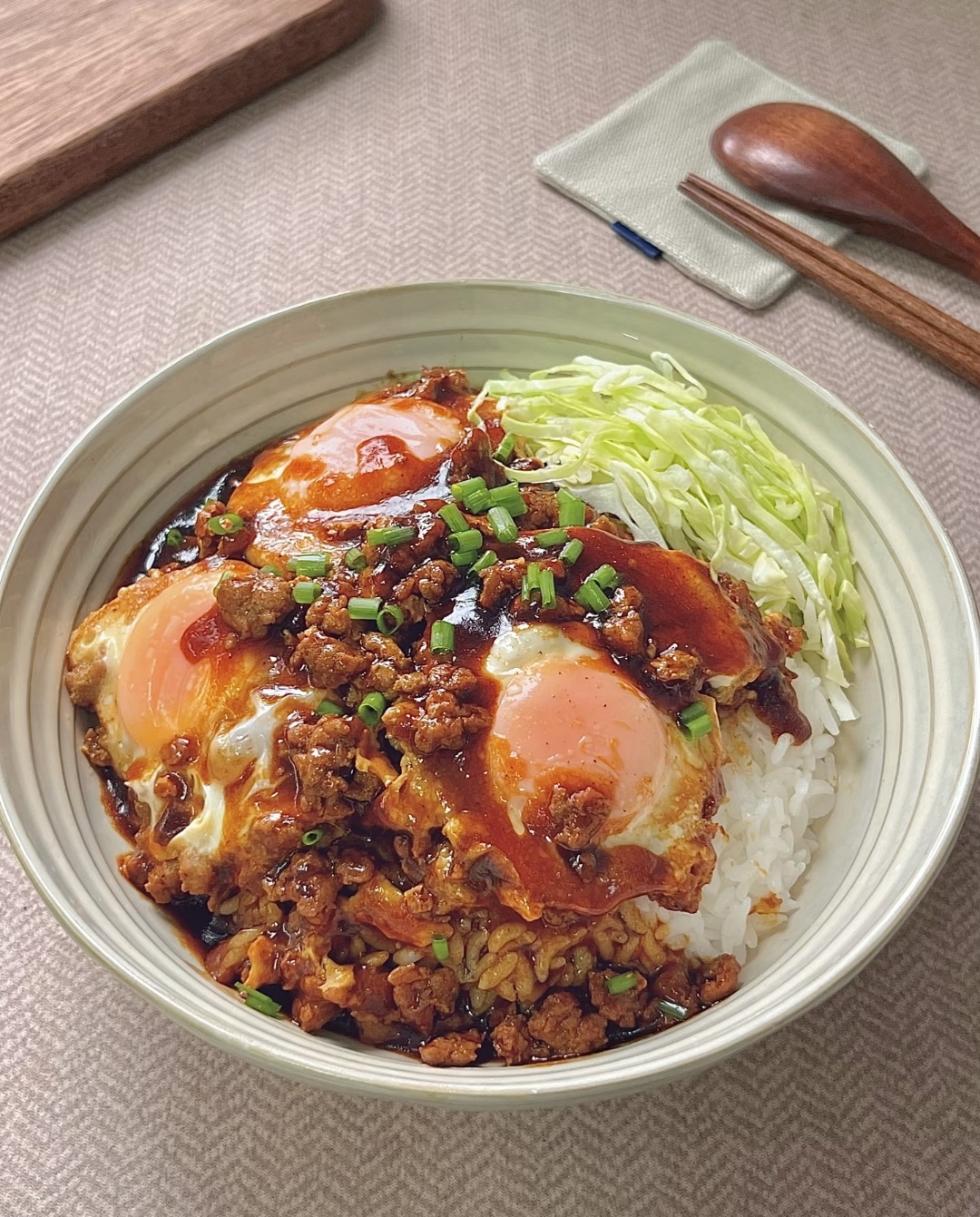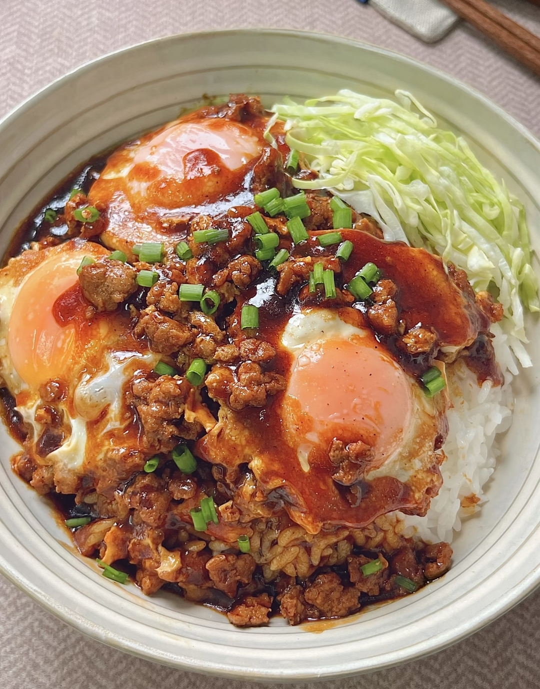 5. 组装完成!把煮好的米饭铺在碗里,淋上一大勺肉沫鸡蛋和浓稠的汤汁,再撒上一把清爽的生菜丝。用筷子从碗底往上拌匀,让每一粒米饭都裹上酱汁,吸满肉香和蛋香,一口下去,咸香适中、软嫩弹牙,生菜丝的清爽中和了肉的油脂,简直绝了!