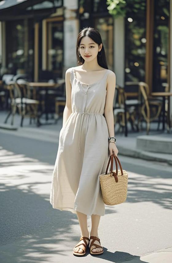 上衣:宽松亚麻连衣裙,V领设计显脖颈线条,腰部抽绳强调比例。裤子:无(连衣裙单穿),怕走光可内搭短裤。鞋子:棕色皮质渔夫凉鞋(关键词:粗绑带、平底圆头),自带复古糙汉气质。配饰:草编托特包、玳瑁框墨镜,增加慵懒感。