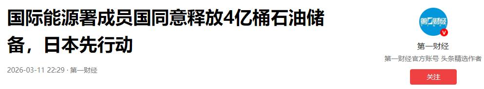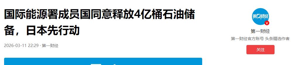 参考资料:国际能源署成员国同意释放4亿桶石油储备,日本先行动 2026-03-11 22:29·第一财经
