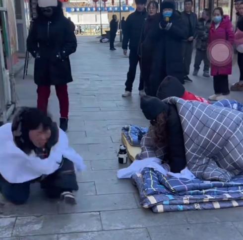 他们不仅在店门口打地铺而且还像哭丧一样痛哭,但这样的行为似乎并未影响到麻辣烫店的生意,屋里屋外的对比真的很讽刺。