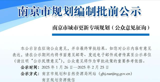 刚刚(1月26日),南京市城市更新专项规划(公众意见征询)重磅出炉,南京多个片区或将启动城市更新。