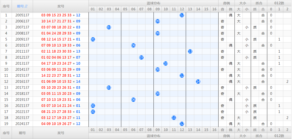 七、历史同期,蓝球开奖号码和走势图(历史数据演示):