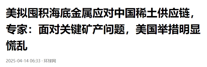 环球网 2025-04-14 06:33美拟囤积海底金属应对中国稀土供应链,专家:面对关键矿产问题,美国举措明显慌乱