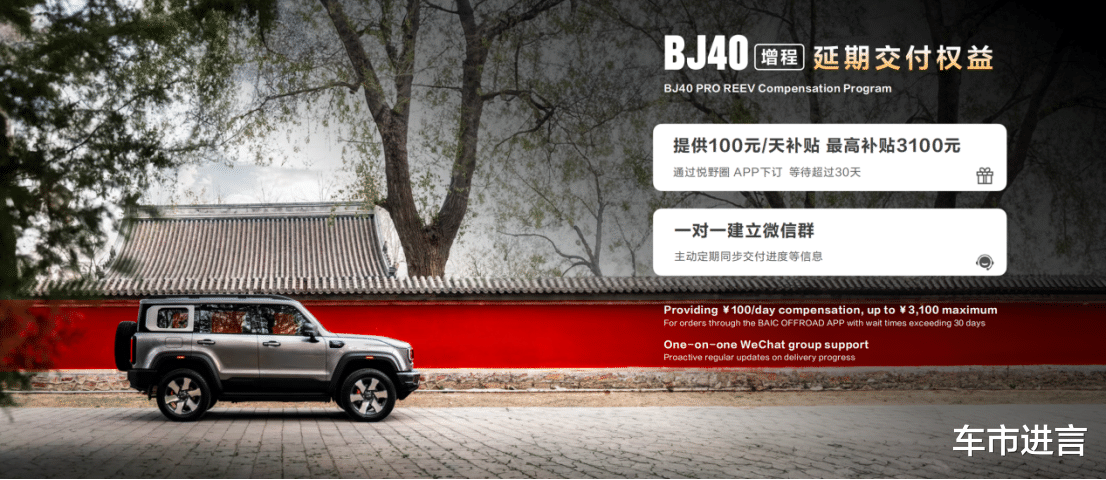 针对可能出现的交付延迟问题,北京越野推出了极具诚意的补偿政策:用户等待超过30天后,将获得100元/天的补贴,最高可达3100元。同时,品牌将为每位用户建立专属服务群,实时同步车辆生产进度。