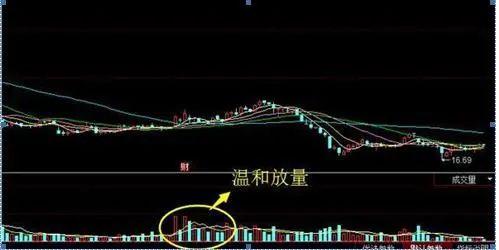 温和放量是指个股在持续低迷之后,成交量突然出现小幅增长,形态看上去像“山”一样的连续温和的放量形态,这种形态也称为“两堆”(后面我们还会介绍“推量”,不要搞混淆了),个股出现这种情况一般说明市场后实力的资金在介入。如果在价格的底部出现“温和放量”,价格会随量上升,量缩时价格会适量调整,调整时间没有方法推测,但调整期过后,价格上涨会加快。所以并不是说一出现“温和放量”投资人就该立刻入场,而是应该在其调整幅度不低于放量前期低点的前提下入场。因为一旦调整低于建仓成本,市场的抛压过大,后市再度调整的可能性便很高。