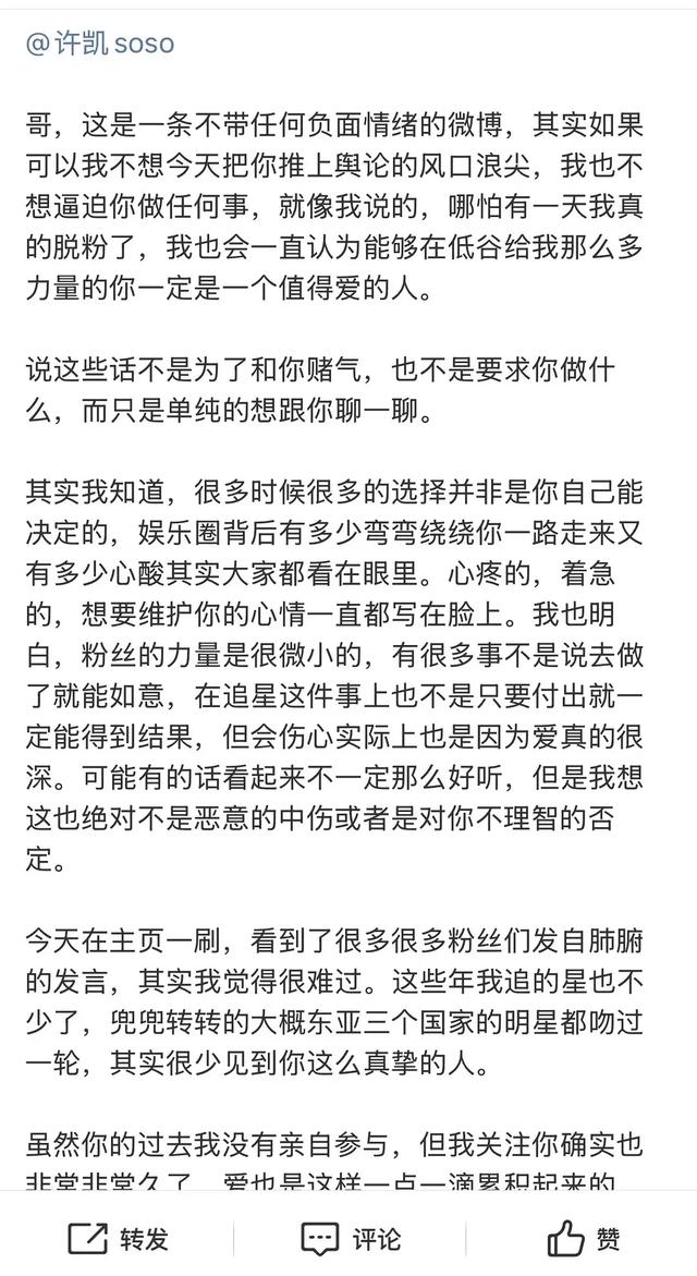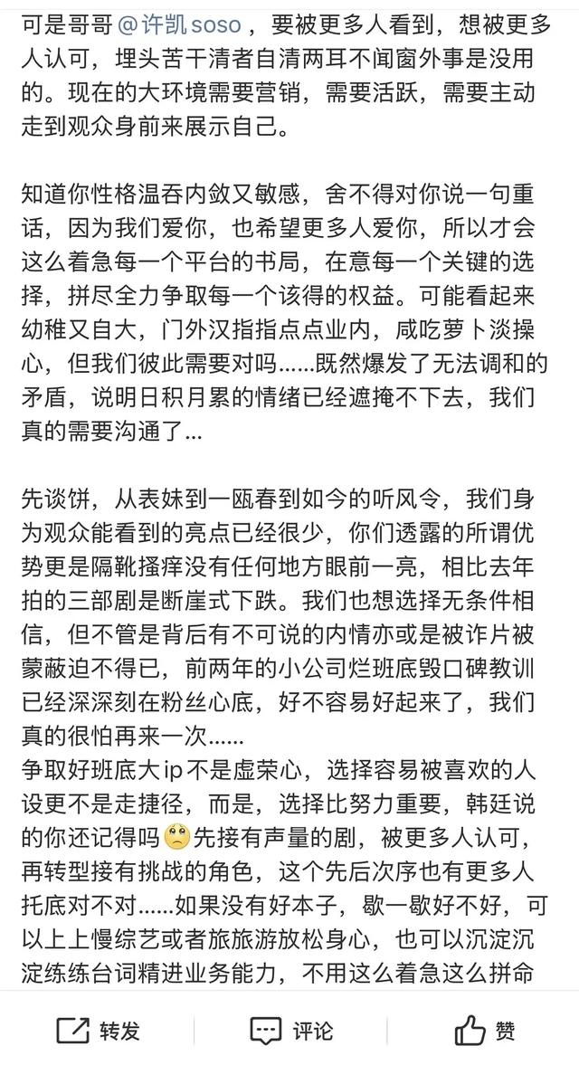 现在搜许凯,全是粉丝在发小作文……接的资源越来越差,都绷不住了。今天传了粉丝不满意的剧本,然后长久积压的不满爆发了。据说和魏哲鸣拍双男主。这种耽改剧,粉丝拒绝他下海。