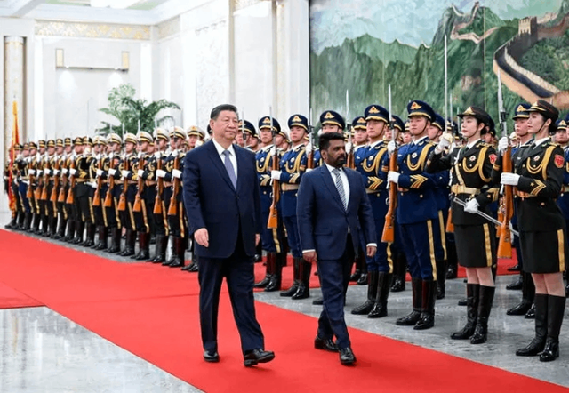 1月15日下午,国家主席习近平在北京人民大会堂同来华进行国事访问的斯里兰卡总统迪萨纳亚克举行会谈。图为会谈前,习近平在人民大会堂北大厅为迪萨纳亚克举行欢迎仪式。新华社记者 黄敬文 摄
