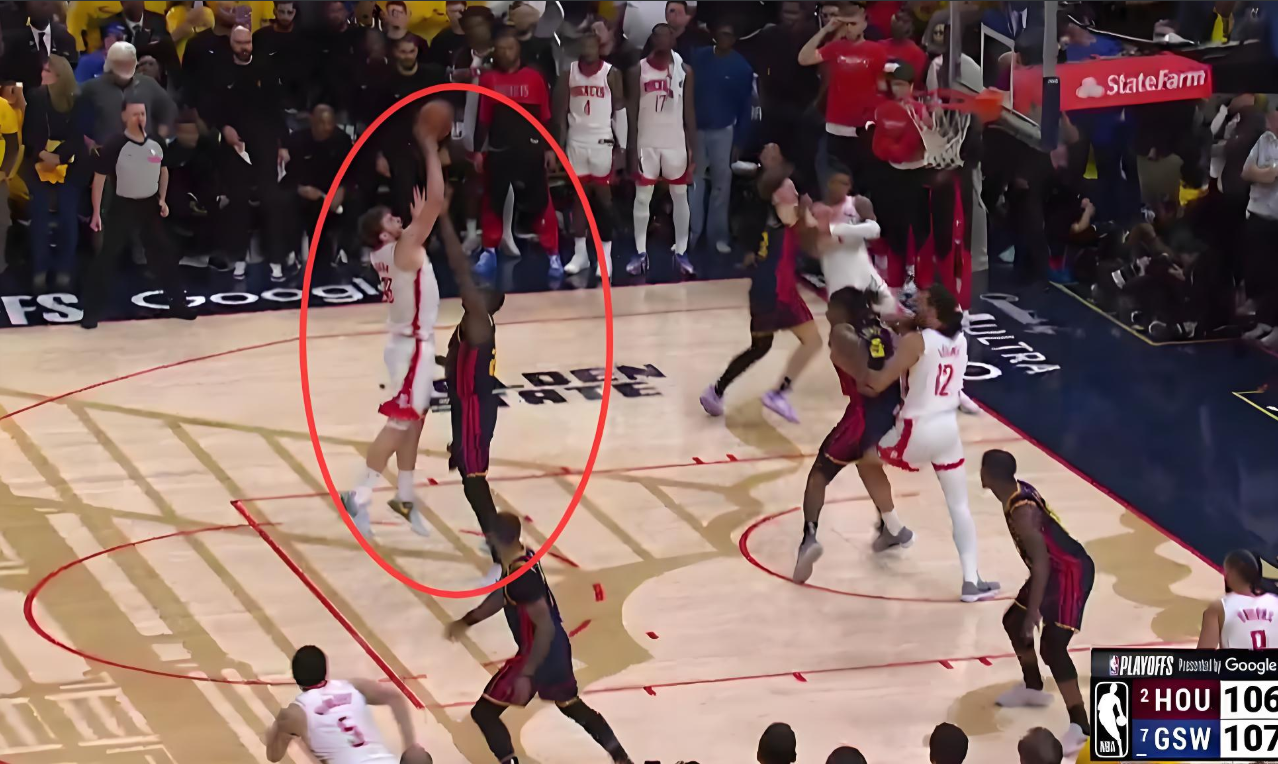 火箭在终场前其实还有一次追平比分的机会,范弗利特持球冲刺,勇士没有来得及犯规,来到勇士三分线外,卢尼上来防守,可惜最后范弗利特三分不中,这球太可惜了,球的方向很正,就是力道小了点。