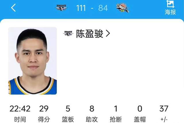 陈盈骏的强大更体现在正负值,高达+37,这项数据全队第一高,这意味着在陈盈骏不在场上的18分钟里,北京队还输了10分,更加体现他的重要性。